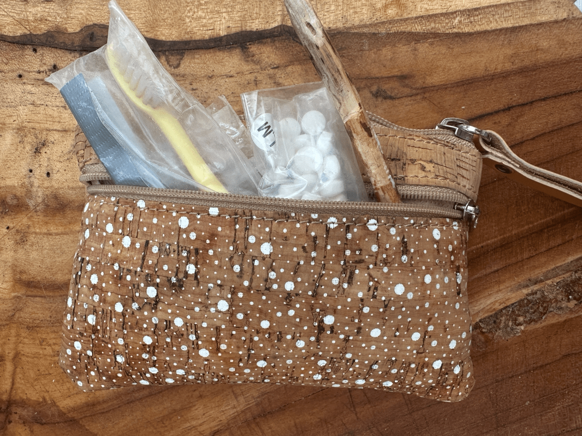 Verwendet wurde für das Hygiene-Kit ein kleines Täschchen aus Kork – nicht größer als eine Handfläche. Es besitzt ein Hauptfach und ein kleines Reißverschlussfach. Perfekt also für alles, was beim Draußensein schnell griffbereit und hygienisch verpackt sein soll.